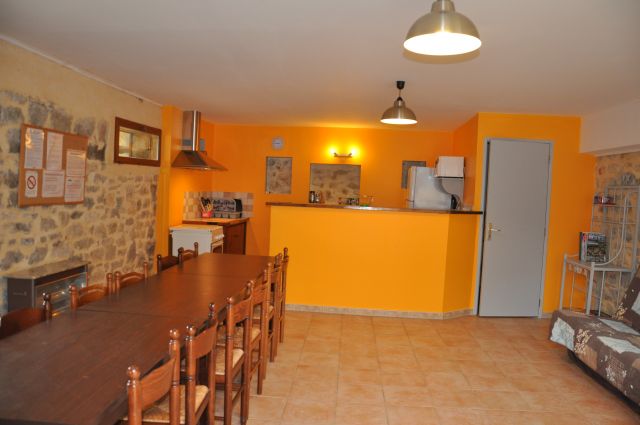 Lors de vos locations à la semaine, vous pouvez cuisiner vous même en utilisant la gazinière, le frigo et toute la vaisselle à votre disposition. Sinon, profitez de notre formule demi pension et utilisez cette salle pour vos veillées, activités, détente.